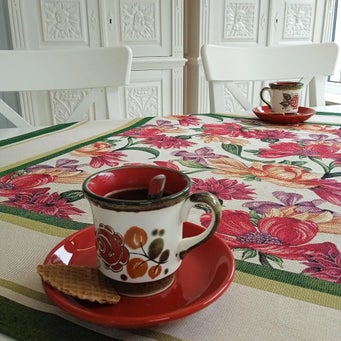Nowadays, these gobelin fabrics are still loved and their used expanded. The versatile fabric can be made into a handbag, a cushion cover or tablecloth. Our high-quality modern gobelin textiles are now woven by machine in Southern Europe.